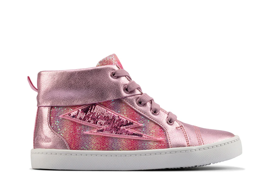 Fun, durable and on-trend, City Myth from Clarks has a fabulous lightning motif on a crafted light-pink leather upper. Built for comfort, this sporty everyday style has a supportive padded collar, easy-on inside fastening zip and a rubber sole with toe bumper for flex and foot protection. Available in whole and half sizes and different widths. UPPER MATERIAL Leather LINING MATERIAL Textile SOLE MATERIAL Textile FASTENING TYPE Lace and Zip REMOVABLE INSOLE No TRIMS Sequins