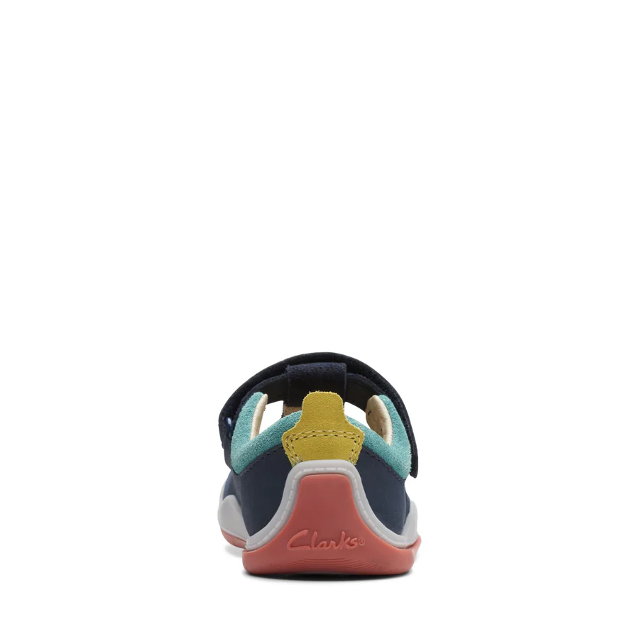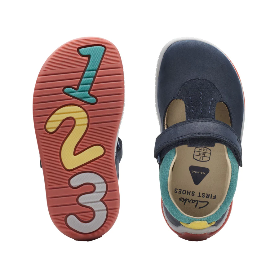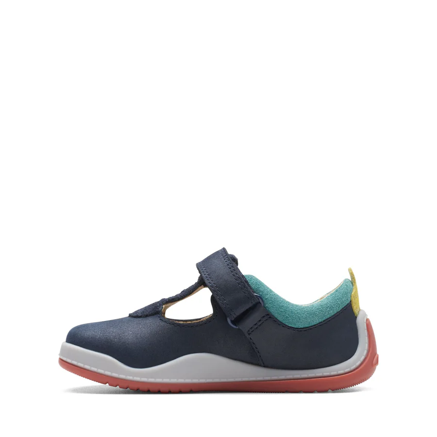 Clarks toddler T-bar shoe Noodle Bright is perfect for mini explorers. Crafted from durable leather in navy combi, it calls on a spongy foam footbed and easy riptape straps to keep little feet comfortable and secure. Underfoot, a flexible, lightweight sole supports their every moment – from wobbling around the furniture to confident steps outdoors.