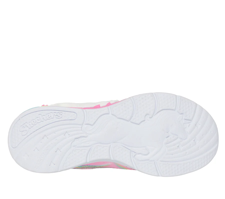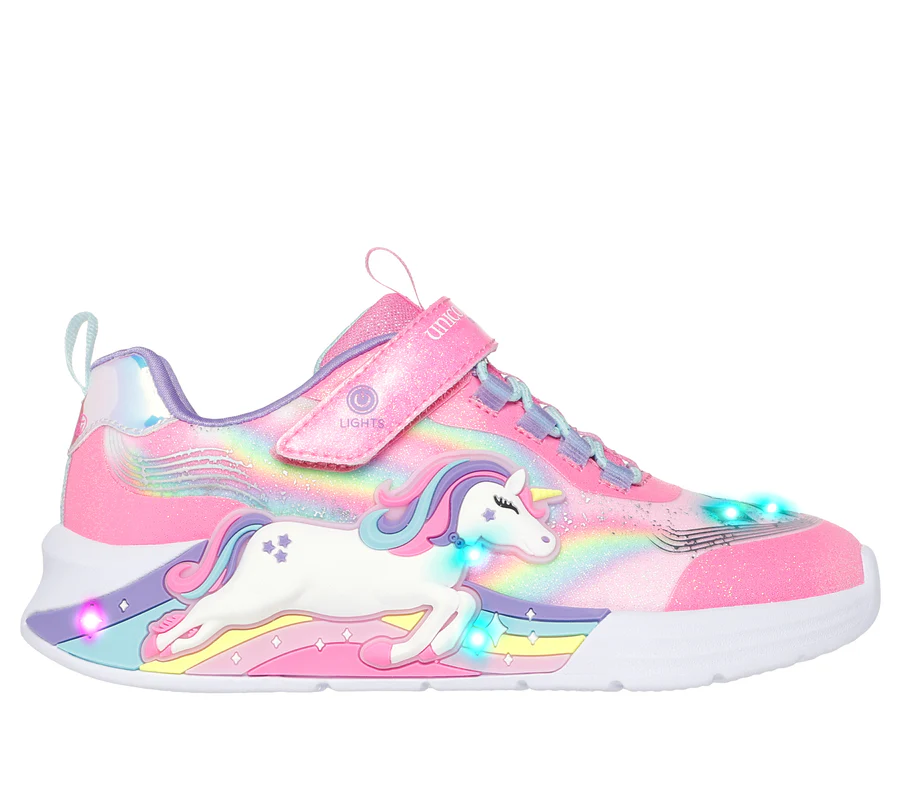 Sparkle and shine in style wearing Skechers S-Lights® Unicorn Chaser. This sporty Magical Collection® lighted design features a synthetic glitter finish upper with unicorn and rainbow side graphic, stretch laces, adjustable instep strap, and a cushioned comfort footbed.
