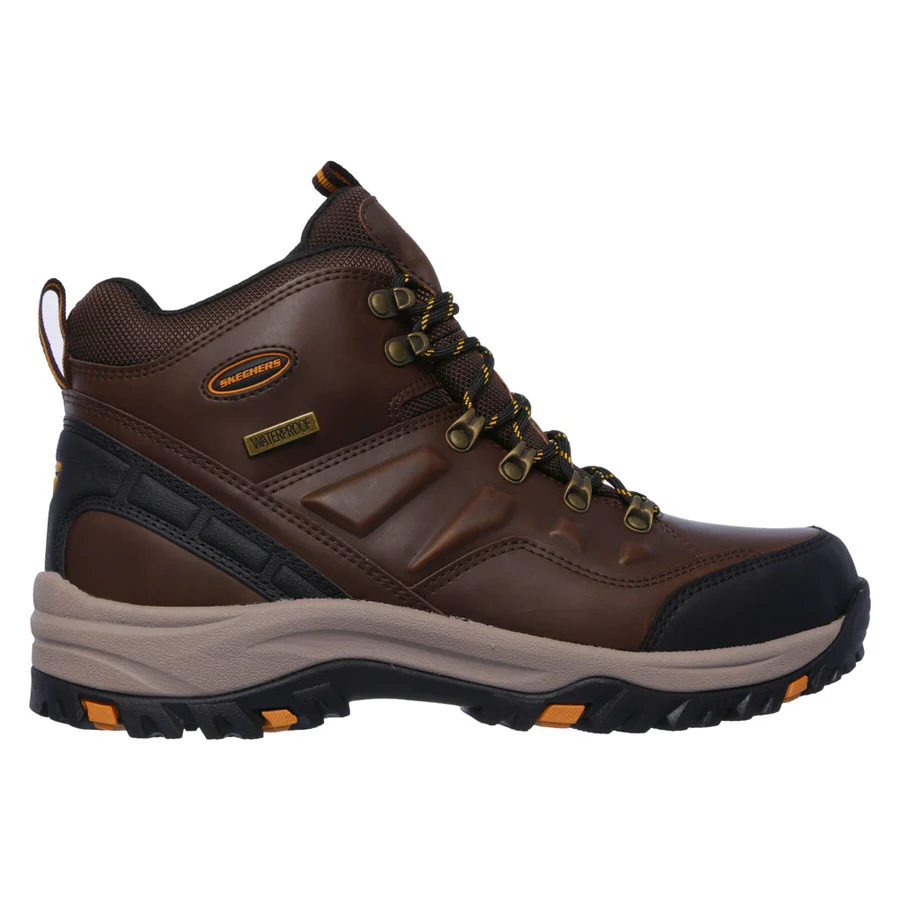 Forge ahead in rugged trail-ready style and comfort with Skechers Relaxed Fit?: Relment – Traven. This lace-up hiking style ankle boot features a waterproof durable smooth leather, synthetic and mesh upper with cushioned Memory Foam insole.
